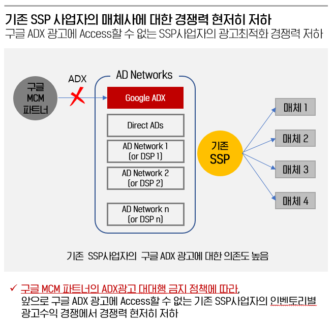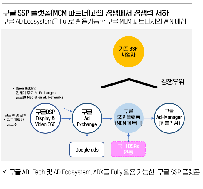 구글 SPM 파트너쉽 프로그램에서 MCM 파트너쉽으로 변화함에 따라 애드익스체인지(ADX) 광고에 접근할수 없는 기존 SSP사업자의 경쟁력이 저하됩니다.